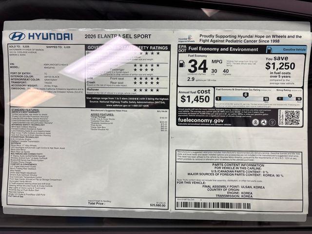 2026 Hyundai Elantra SEL Sport, Backup Camera, Bluetooth, AM/FM radio, Apple CarPlay & Android Auto, Auto High-beam Headlights, Automatic temperature control, Cargo Blocks, Cargo Package, Cargo Side Bins, Cargo Tray, Carpeted Floor Mats, First Aid Kit, Front dual zone A/C, Fully automatic headlights, Illuminated entry, Outside temperature display, Remote keyless entry, Roadside Assistance Kit, Security system, Severe Weather Kit, Steering wheel mounted audio controls, Telescoping steering wheel, Tilt steering wheel.