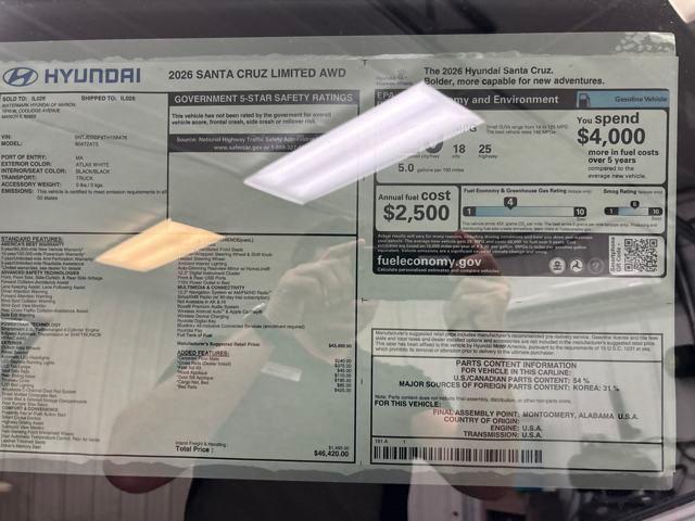 2026 Hyundai Santa Cruz Limited 2.5L, Backup Camera, Bluetooth, 8 Speakers, AM/FM radio: SiriusXM, Apple CarPlay & Android Auto, Auto High-beam Headlights, Auto-dimming Rear-View mirror, Auto-leveling suspension, Automatic temperature control, Bed Cargo Net, Brake assist, Carpeted Floor Mats, Cross Rails, Dual front impact airbags, Dual front side impact airbags, Emergency communication system: Bluelink+, First Aid Kit, Four wheel independent suspension, Front anti-roll bar, Front dual zone A/C, Garage door transmitter: HomeLink, Heated & Ventilated Front Bucket Seats, Heated door mirrors, Heated steering wheel, Hood Applique, Illuminated entry, Leather Shift Knob, Leather steering wheel, Leather-Trimmed Seat Trim, Low tire pressure warning, Memory seat, Navigation System, Occupant sensing airbag, Outside temperature display, Overhead airbag, Overhead console, Power driver seat, Power moonroof, Power passenger seat, Rain sensing wipers, Rear anti-roll bar, Rear side impact airbag, Rear step bumper, Remote keyless entry, Security system, Steering wheel mounted audio controls, Telescoping steering wheel, Tilt steering wheel.