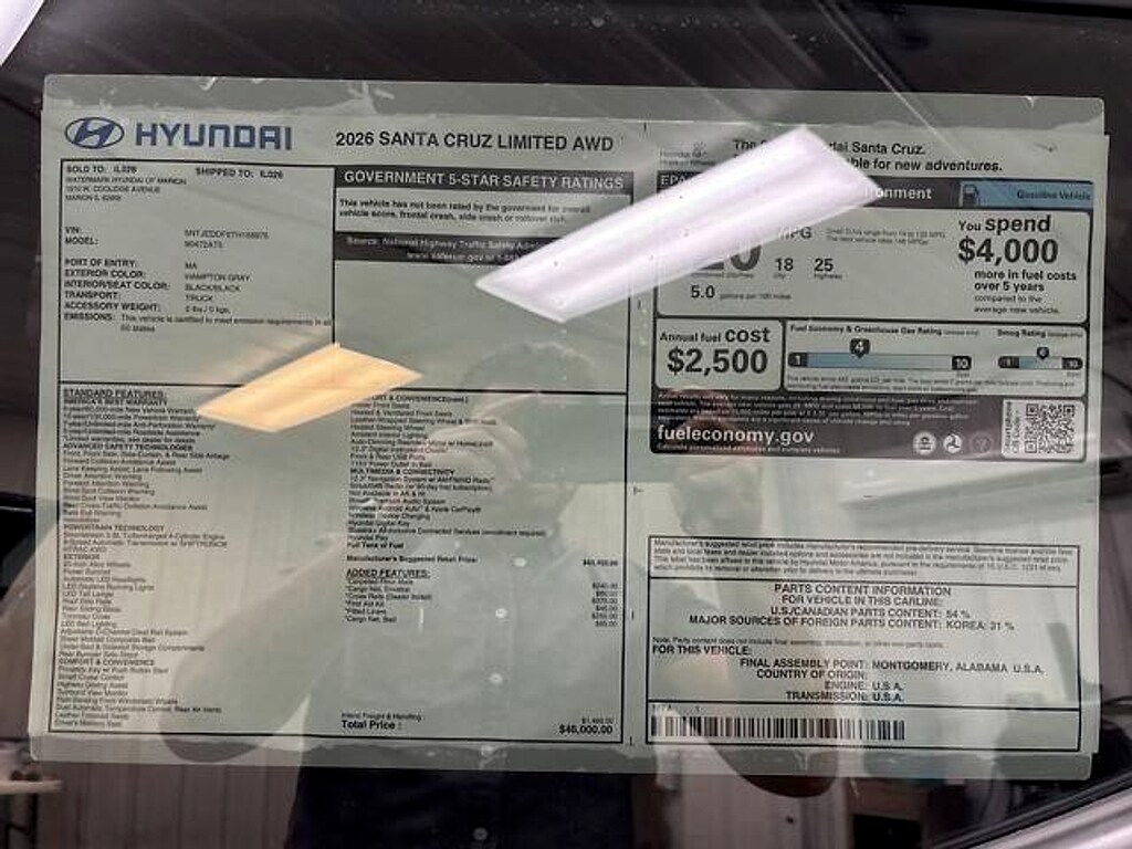 Introducing the 2026 Hyundai Santa Cruz Limited AWD, a striking blend of style and performance that redefines versatility in the modern driving experience. Dressed in an eye-catching Hampton Gray exterior, this vehicle stands out on the road while the sleek black interior provides a sophisticated and comfortable environment for all passengers. Under the hood, the Santa Cruz Limited is powered by a robust 2.5-liter DOHC turbo engine, delivering an exhilarating driving experience with exceptional fuel efficiency. The advanced all-wheel-drive system ensures confidence and control in any driving condition, making it the perfect companion for both urban commutes and weekend adventures. Packed with cutting-edge features, the Santa Cruz Limited boasts an array of technology and safety enhancements that enhance your driving confidence. From intuitive infotainment systems to comprehensive driver-assistance features, every journey is made more enjoyable and secure. Experience the unique blend of a pickup's utility and a crossover's comfort in the 2026 Hyundai Santa Cruz Limited AWD. Elevate your drive and embrace the possibilities with this extraordinary vehicle. Visit us today to learn more and schedule a test drive! Advertised price includes: $1,750 HMA Retail Bonus Cash (expires 05/01/2026)