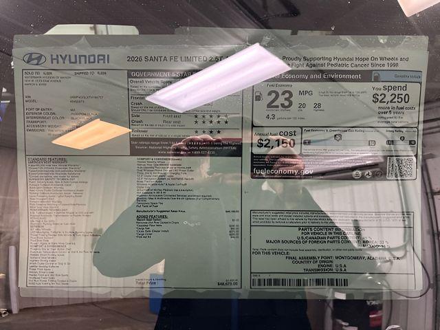 2026 Hyundai Santa Fe Limited 2.5L, Backup Camera, Bluetooth, 12 Speakers, All Season Fitted Liners, Apple CarPlay & Android Auto, Auto High-beam Headlights, Auto-dimming Rear-View mirror, Automatic temperature control, Cargo Cover/Screen, Cargo Net, Carpeted Floor Mats, First Aid Kit, Four wheel independent suspension, Front dual zone A/C, Fully automatic headlights, Garage door transmitter: HomeLink, Heated door mirrors, Heated front seats, Heated rear seats, Heated steering wheel, Illuminated entry, Leather Seat Trim, Leather steering wheel, Memory seat, Navigation System, Outside temperature display, Overhead console, Power driver seat, Power moonroof, Power passenger seat, Rain sensing wipers, Remote keyless entry, Security system, Steering wheel mounted audio controls, Telescoping steering wheel, Tilt steering wheel, Ventilated front seats.