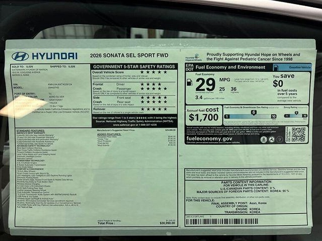 Introducing the 2026 Hyundai Sonata SEL Sport FWD, a modern blend of style, performance, and comfort. Dressed in a sleek Aero Silver exterior, this sedan commands attention on the road with its dynamic lines and sporty design. Inside, passengers are welcomed with a sophisticated gray interior that perfectly complements the vehicle's exterior aesthetics. Powered by a robust 2.5-liter DOHC engine, the Sonata SEL Sport delivers an exhilarating driving experience while ensuring fuel efficiency. Whether navigating city streets or cruising on the highway, this vehicle offers a smooth ride and responsive handling, making every journey enjoyable. The Sonata SEL Sport is equipped with advanced technology and safety features, ensuring peace of mind and convenience at every turn. With its spacious interior and cutting-edge infotainment system, the Sonata caters to both driver and passenger needs. Experience the perfect combination of elegance and practicality with the 2026 Hyundai Sonata SEL Sport FWD. Elevate your driving experience today!
